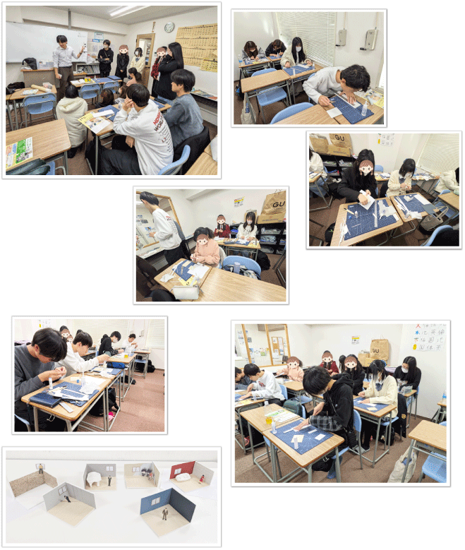 東京テクニカルカレッジにお越しいただくのは2回目です。今回も学びあり笑いありの楽しい出張授業となりました。特に生徒たちが集中してミニチュア模型制作に取り組んでいる様子が印象的でした。それぞれが感性を活かした素晴らしい模型を作ることができました。